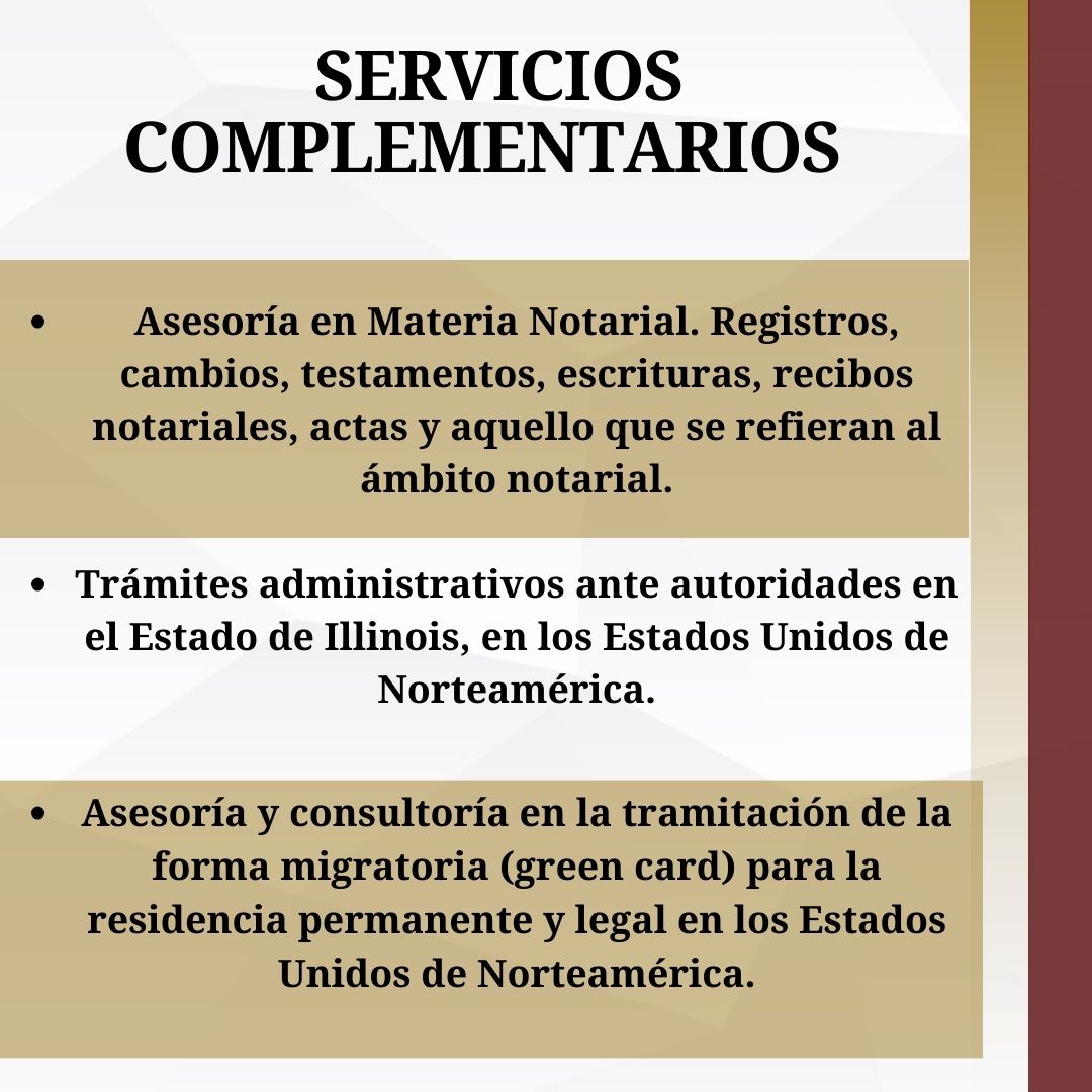![]() -Consultoría y asesoría jurídica en materia de contratos mercantiles de compraventa, comisión corretaje, depósito, fideicomiso, prestación de servicios, obra y todos aquellos que se relacionen con la materia Mercantil. -Defensa y cobro litigioso en juicios ordinarios, juicios ejecutivos, recuperación judicial y extrajudicial de cuentas y créditos, juicios especiales, hipotecarios, quirografarios, quiebra y sus- pensión de pagos, recuperación de créditos, refaccionarios, habilitación o de obra. |